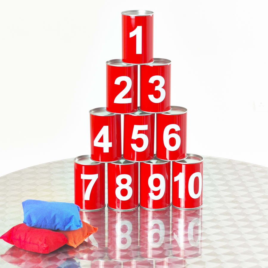 A classic fairground game. Throwing the bean bags, the aim is to knock down as many tins down as possible. Who will win? The adults or the children?