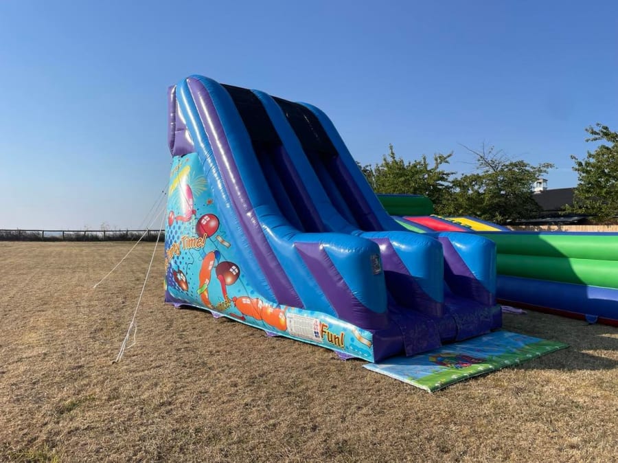 Our 'Party Time' slide will certainly be the centre of attraction at your next party. With a platform height of 10ft, and an overall height of 14.3ft this inflatable is very eye catching. The kids will have immense fun scaling the steps, and whizzing down the slide again.