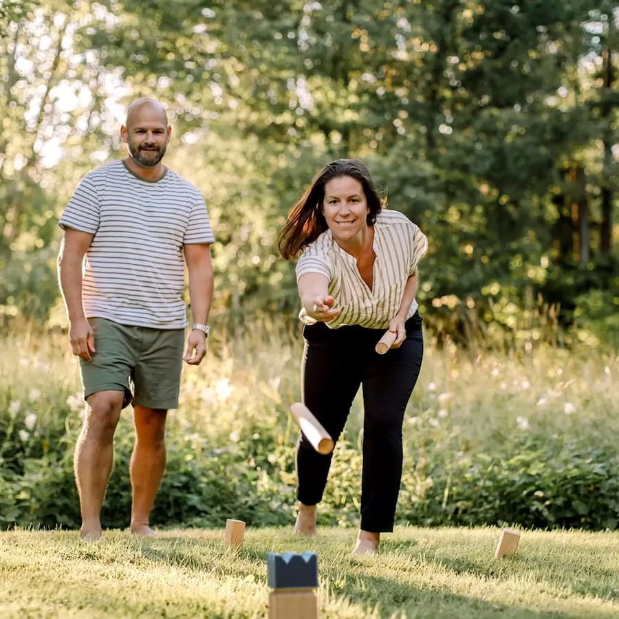 Kubb is a traditional lawn game, similar in nature to a combination of Bowls and Horseshoes. It can be played by individuals or in teams. The objective is to throw the Kastpinnar with the intention of knocking over all of your opponents Kubbs, followed by the King, before they knock down your Kubbs and the King. A game can last anywhere from five minutes to well over an hour. A perfect party game for your garden party.